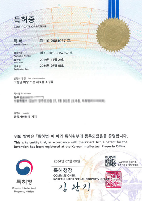 혈행 개선 관련 특허도 보유하고 있습니다.